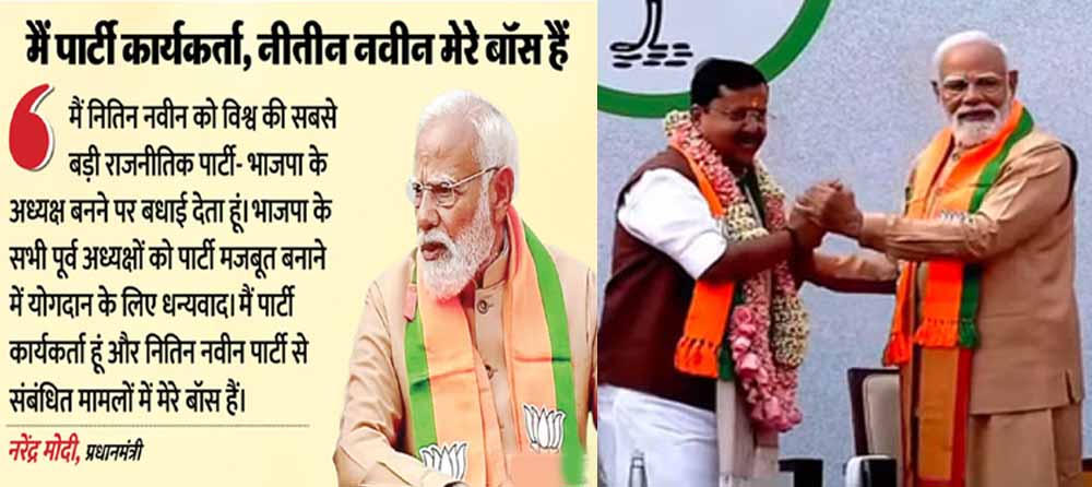 पीएम मोदी ने नितिन नवीन को शुभकामनाएं देते हुए कहा कि नितिन नवीन को दुनिया के सबसे बड़े राजनीतिक दल का राष्ट्रीय अध्यक्ष चुने जाने पर बधाई देता हूं। पीएम मोदी ने कहा कि भाजपा का ये संगठन पर्व देश के कार्यकर्ता केंद्रित सोच का प्रतीक है। पीएम मोदी ने कहा, 'हमारा नेतृत्व परंपरा से चलता है, अनुभव से समृद्ध होता है और जनसेवा-राष्ट्रसेवा के भाव से संगठन को आगे बढ़ाता है। हमने शून्य से शिखर तक का सफर देखा है।' पीएम मोदी ने भाजपा के सभी पूर्व अध्यक्षों का अभिनंदन किया। उन्होंने कहा कि आज भाजपा का जितना फोकस संगठन के विस्तार पर है, उतना ही कार्यकर्ता के निर्माण पर भी है। उन्होंने कहा कि मैं मुख्यमंत्री से लेकर प्रधानमंत्री भी रहा, लेकिन मैं भाजपा का कार्यकर्ता रहा। उन्होंने कहा कि मैं कार्यकर्ता हूं और नितिन नवीन मेरे बॉस हैं।