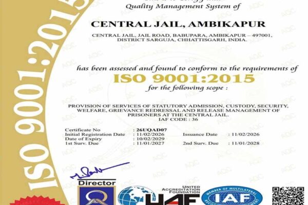 छत्तीसगढ़ की 4 सेंट्रल जेलों को मिला आईएसओ गुणवत्ता प्रमाणन