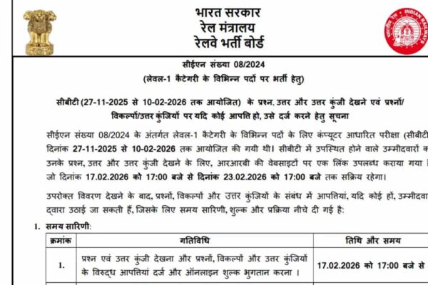 नई दिल्ली रेलवे भर्ती बोर्ड आज 17 फरवरी को शाम 5 बजे आरआरबी ग्रुप डी भर्ती परीक्षा 2024 ( विज्ञापन संख्या 08/2024) की आंसर-की जारी करेगा। परीक्षार्थी अपने अपने रीजनल आरआरबी की वेबसाइट पर जाकर या नीचे दिए गए डायरेक्ट लिंक पर क्लिक कर आंसर-की चेक व डाउनलोड कर सकेंगे। आंसर-की के साथ साथ क्वेश्चन…