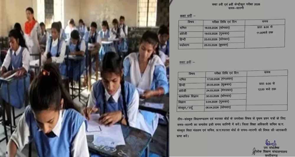 छत्तीसगढ़ लोक शिक्षा संचालनालय ने कक्षा 5वीं और 8वीं की वार्षिक परीक्षा की समय सारिणी जारी कर दी है. इस बार परीक्षाएं बोर्ड पैटर्न में आयोजित की जाएगी. जारी एग्जाम शेड्यूल में 5वीं कक्षा की 16 मार्च और 8वीं कक्षा की 17 मार्च से वार्षिक परीक्षा (Final Examination Schedule) आयोजित होंगी.