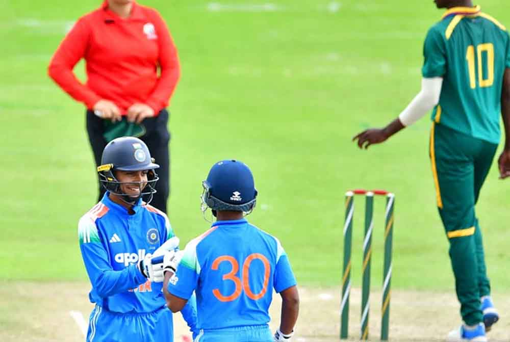 यूथ ओडीआई सीरीज में भारत और दक्षिण अफ्रीका के बीच तीसरा मुकाबला बुधवार को बेनोनी में खेला जा रहा है। भारत ने तीसरे मुकाबले में पहले बल्लेबाजी करते हुए अच्छी शुरुआत की है। भारत को वैभव सूर्यवंशी के रूप में पहला झटका लगा। वैभव 74 गेंद में 127 रन बनाकर आउट हुए। उन्होंने अपनी पारी में 9 चौके और 10 छक्के लगाए। वैभव और आरोन के बीच पहले विकेट के लिए 154 गेंद में 227 रन की साझेदारी हुई। आरोन जॉर्ज 106 गेंद में 118 रन बनाकर आउट हुए। वेदांत 43 गेंद में 34 रन बनाकर आउट हुए। हरवंश रन आउट हुए। अभिज्ञान कुंडू ने 20 गेंद में 21 रन बनाए। कनिष्क 10 और एम्ब्रिश 8 रन बनाकर आउट हुए।